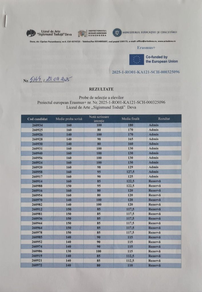 În data de 29.09.2025, s-au afișat rezultatele procesului de selecție pentru mobilitățile Erasmus+ din cadrul proiectului cu numărul 2025-1-RO01-KA121-SCH-000325096.